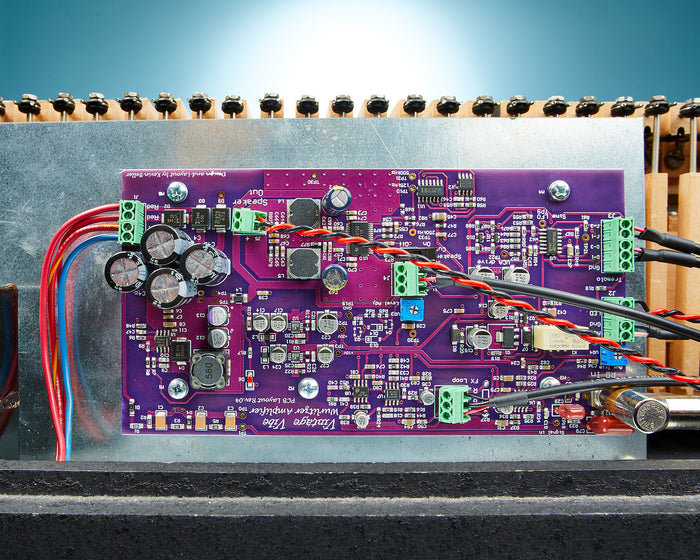 We install stereo reverb into Fender Rhodes Suitcase pianos. The reverb is comprised of drive and recovery circuits for both the left and right channels, a 3-spring, medium decay pan for each channel, depth control and bypass switching and supporting circuitry.