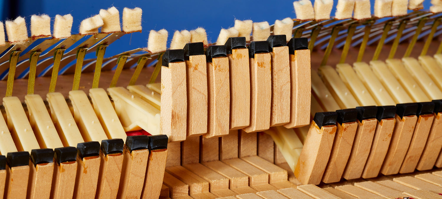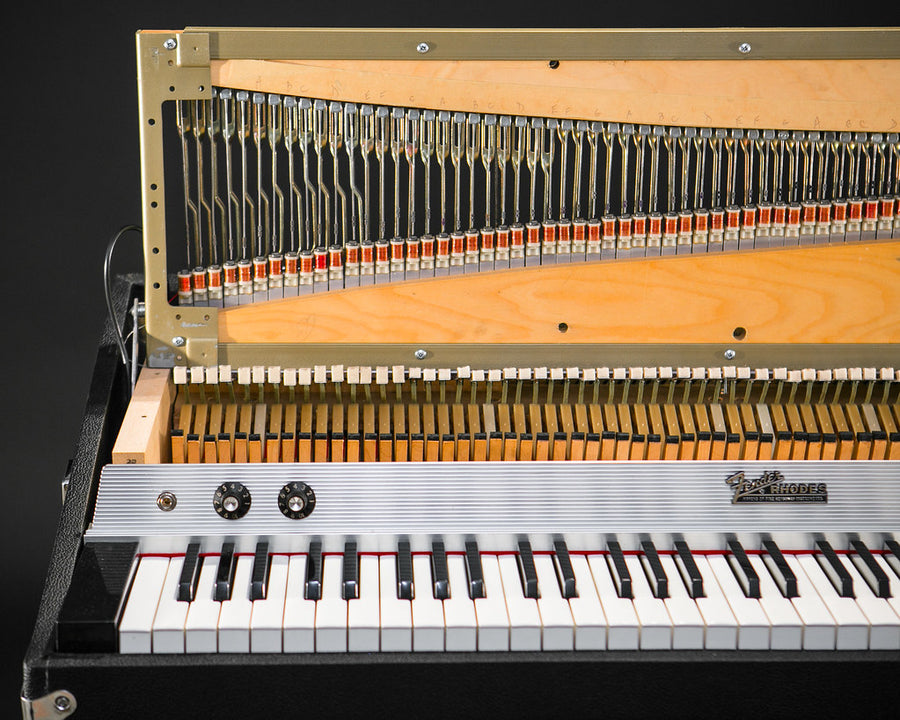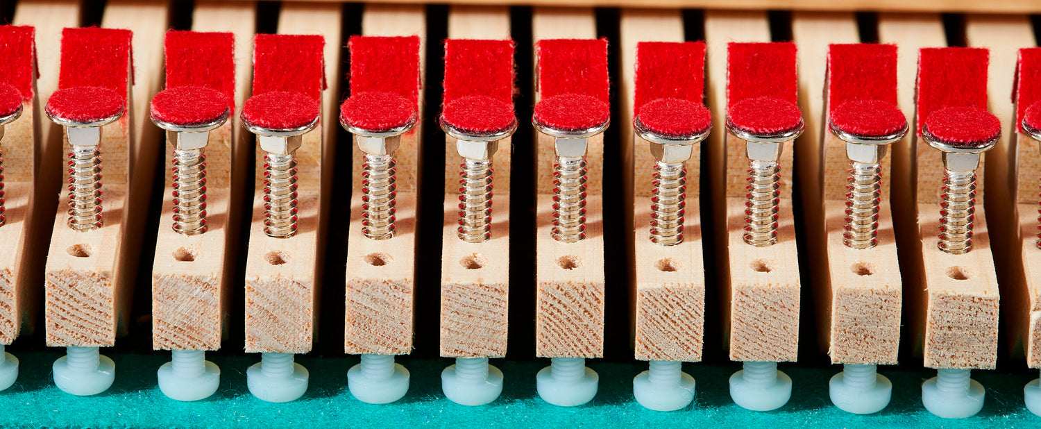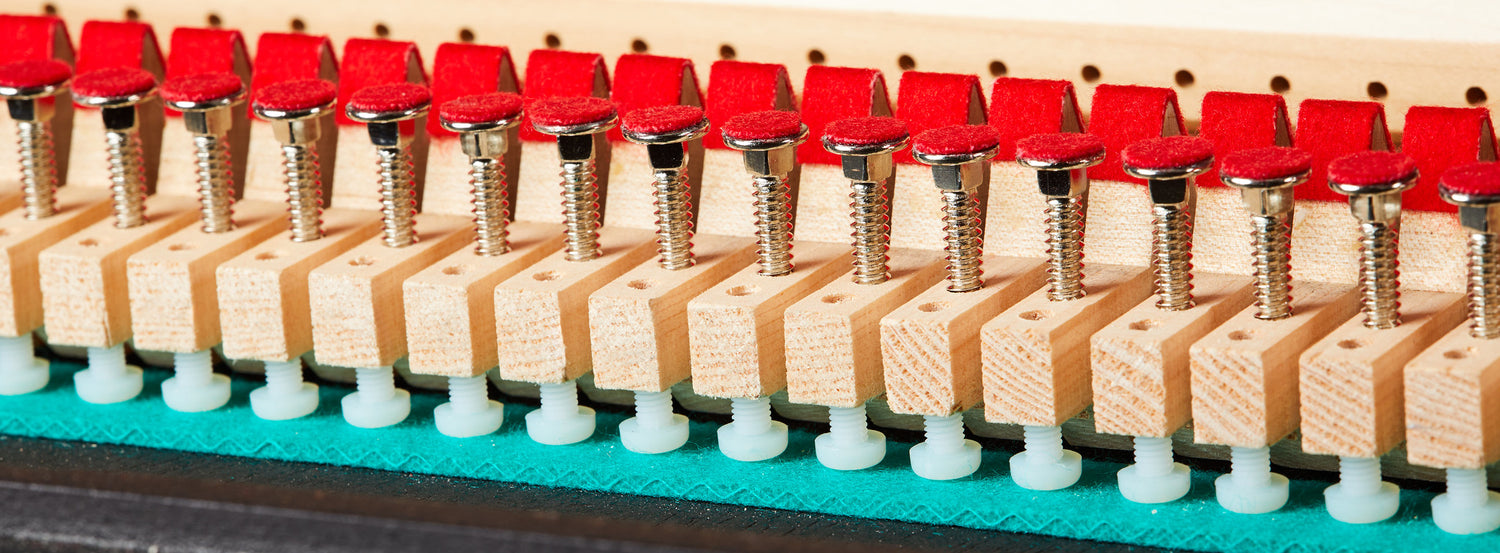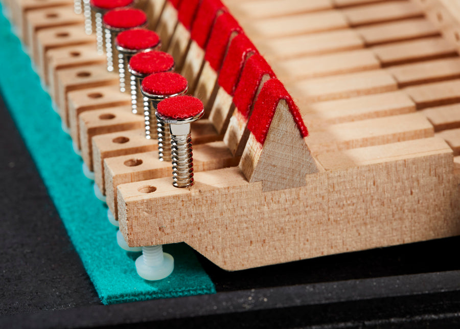 It is the art of ensuring an even feel and dynamic response across the range of the piano key bed. Through the use of shims and felt back-rail felt thickness, the traditional Rhodes design only offers broad global adjustments regarding key dip, hammer throw, and escapement. Individual fine adjustments of the piano's action were never previously considered. Throughout our years of restoring vintage instruments, as well as creating our unique piano, our primary goal in terms of the action has been to develop and improve upon regulatory procedures which we have pioneered over the years.