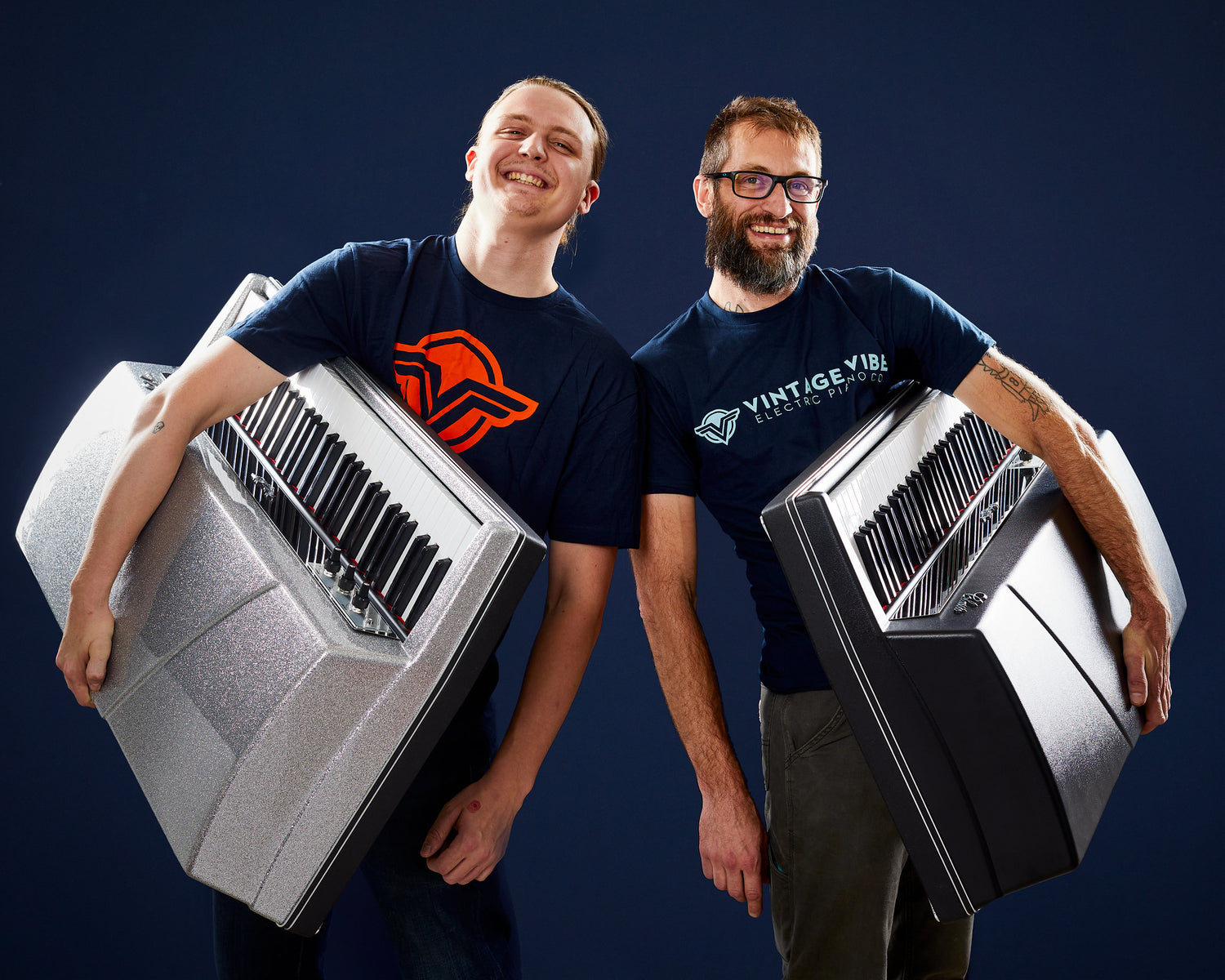 Thirteen years ago, Chris Carroll and Fred DiLeone embarked on a bold adventure to design and build the world's first compact, lightweight Rhodes-style piano. The 53-pound 64-note Vintage Vibe Piano was born without compromising tone or feel. The flagship 73-note Piano soon followed at 60 pounds. Today our pianos outperform any vintage or modern electric piano in feel, dynamic response, reliability, and portability. No other piano has come close to our compact size, lightweight, and dynamic tone.